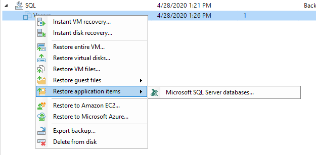 Select the server you want to restore and select Restore Application items -> SQL server databases.