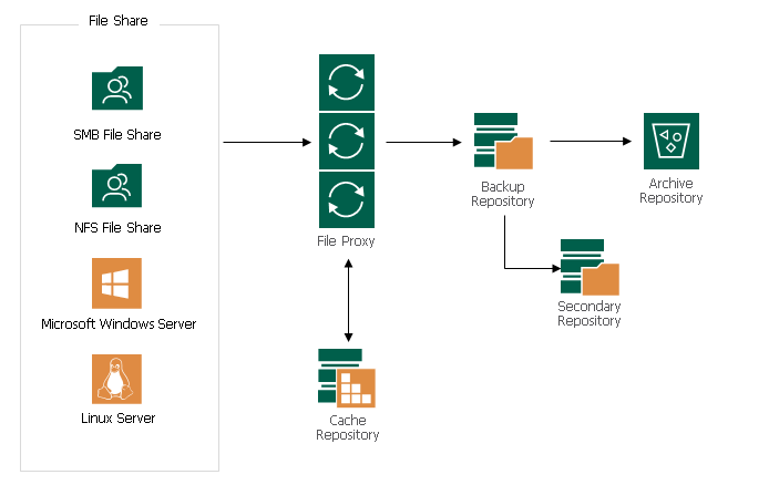 A file proxy is an architecture component that sits between the file share and other components of the backup infrastructure. The file proxy operates as a data mover that transfers data between the source file share and the backup repository. The file proxy processes jobs and delivers backup and restore traffic.