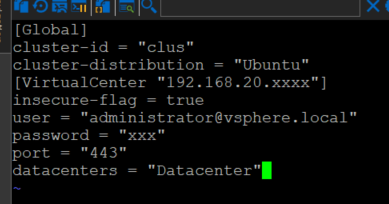 Next, we will need to create the CPI configMap by creating the below .conf file using the parameters that match our vCenter. You can also see that we specify the secret to use in this config.
