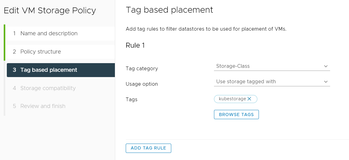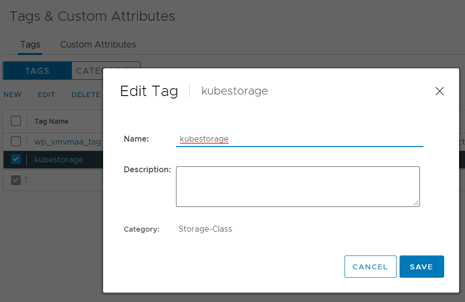 We do this by navigating to Tags & Custom attributes and create a new category called “Storage-Class” and a new tag called ‘KubeStorage”. When you are done it should look like this.