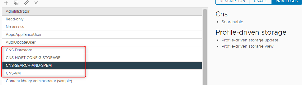 Because this is my lab environment and im lazy, I chose to just use my admin account but in the real world I would ensure that we use the least amount of privileges, so to adhere to that we would want to limit the scope of what the CNS account can do. We can accomplish this by following the (once again) awesome documentation that outlines the permissions required. When you are done you should see 4 additional roles as below.