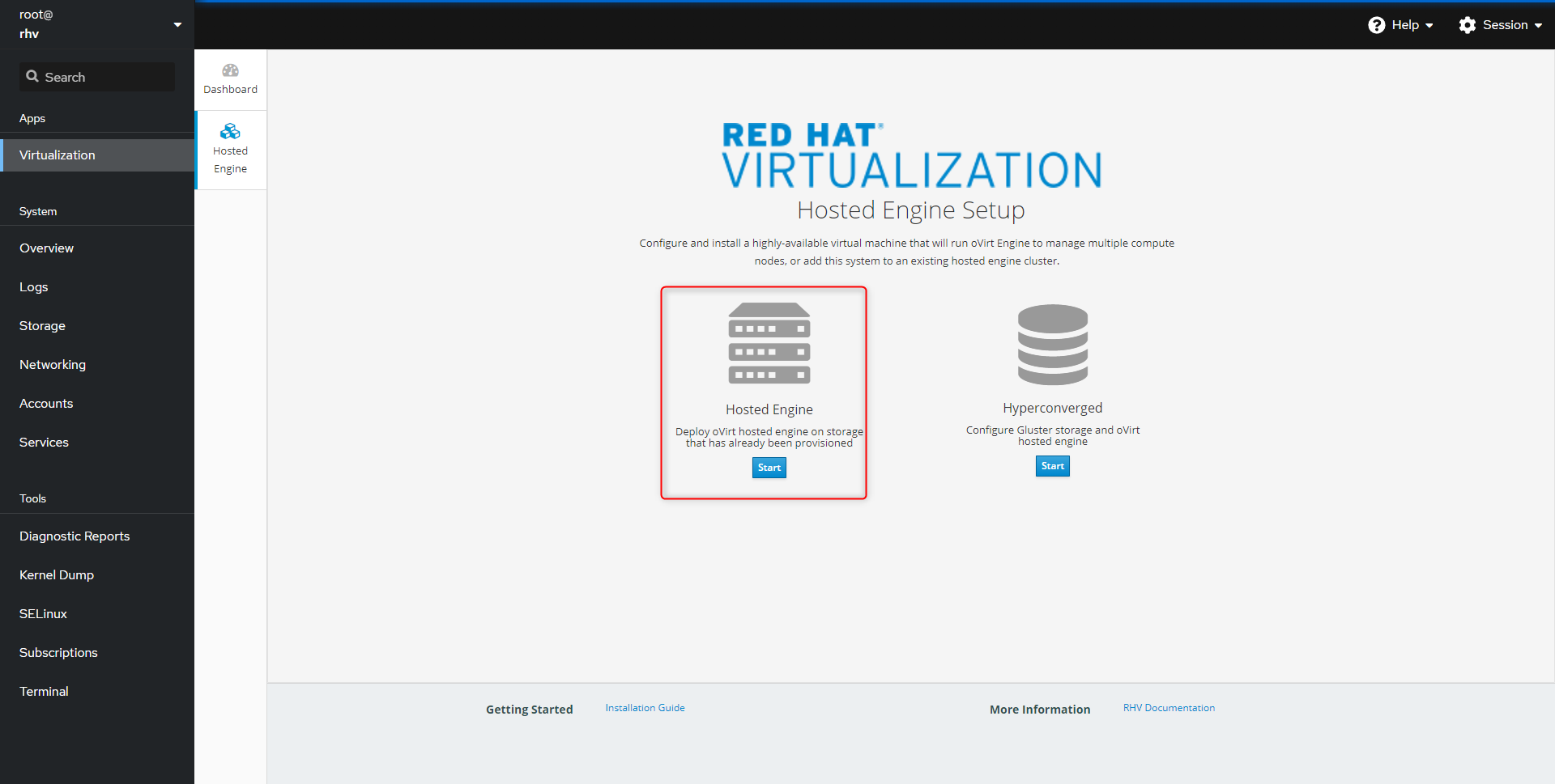 - Navigate to Virtualization and select Hosted Engine