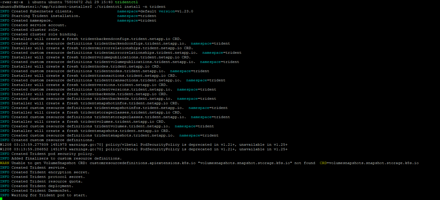 run the command ./tridentctl install -n trident from the extracted folder, this should generate some output which means its in the process of deploying the Trident pod into the trident namespace.