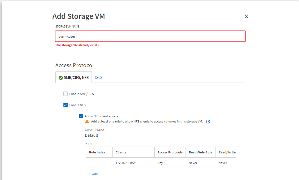 - Give your SVM a name, enable NFS and provide some IP addresses for the NFS interface.