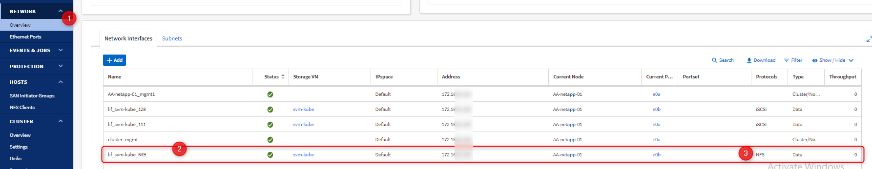 - Navigating to the “Network” tab we can now see our new “Data” interfaces, we can see that they are assigned to the SVM we created and are of type DATA and have the NFS protocol assigned.