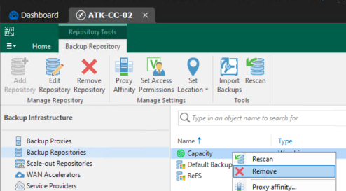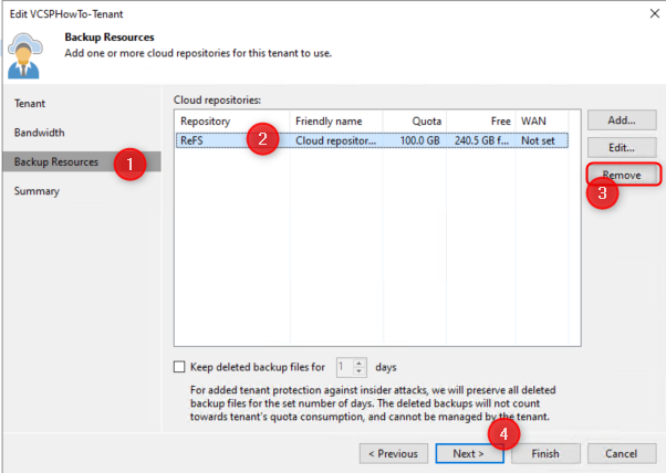 • Navigate to the CloudConnect Server and delete the tenant’s Backup Resources.