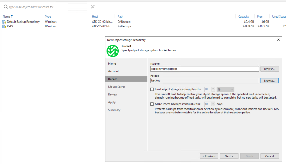 • In my case I will create a new bucket in Wasabi called Capacity and map it accordingly.