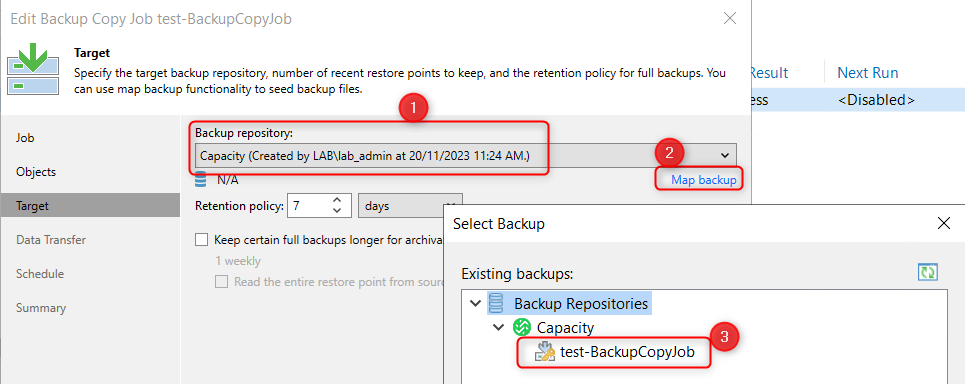 • On the “Target” page, change the repo to the Object Storage and select Map Backup.