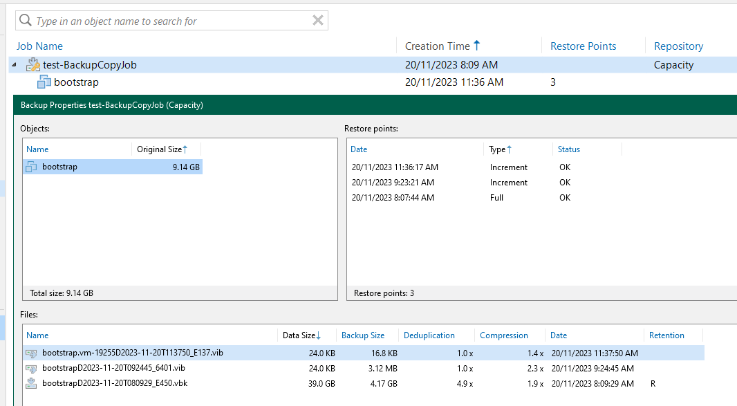 • We can confirm this is working as our BCJ now shows 3 restore points, continuing from the existing chain.