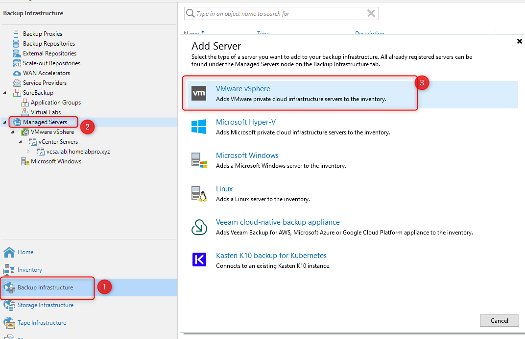 - Managed Servers -> Add VMware vSphere -> vSphere.