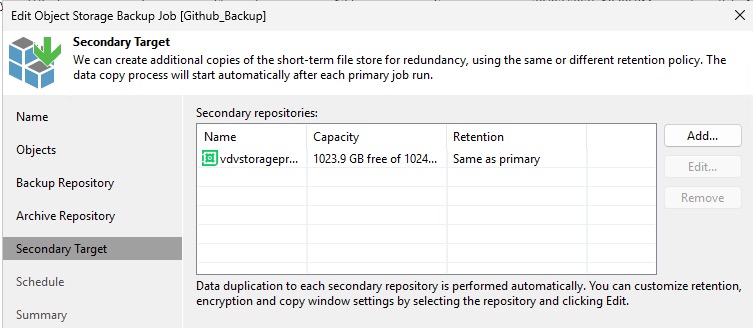 To get started, we need to create a backup job that targets an S3 storage location—the home for our GitHub repository bundles. These bundles are generated using a pre-script that automates the process.