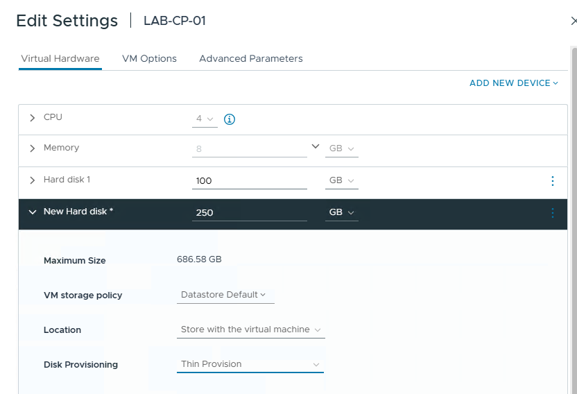 Just to show this, I’ve added a 250GB disk within vCenter (This was done on both the control plane and the worker node):