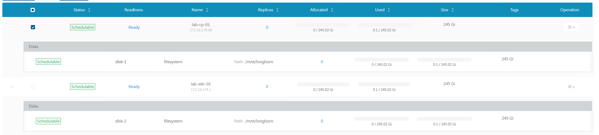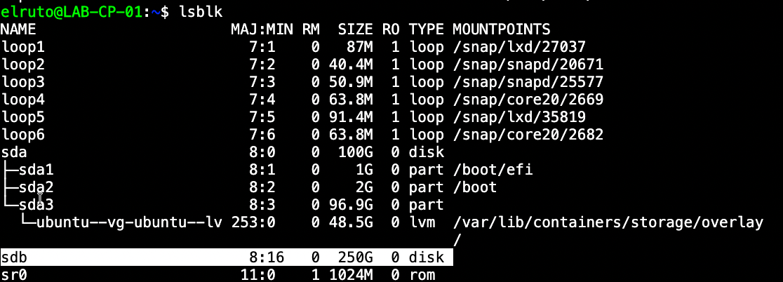 Once all the configuration is done, save it and repeat this process for all nodes in your cluster. Finally, we can confirm it’s all completed on all nodes. As we can see in my cluster, there’s now a 250GB disk available for each node: