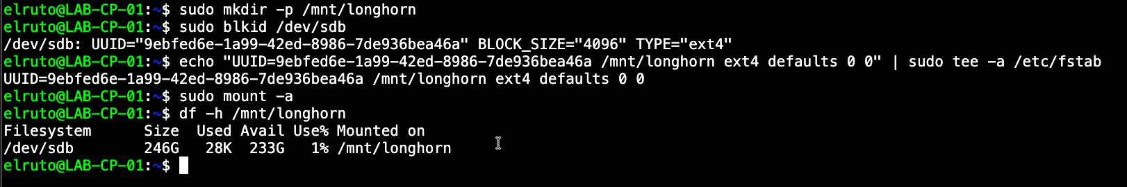 echo "UUID=<your-uuid> /mnt/longhorn ext4 defaults 0 0" | sudo tee -a /etc/fstab
