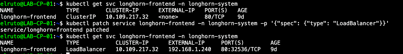 kubectl patch service longhorn-frontend -n longhorn-system -p '{"spec": {"type": "LoadBalancer"}}'