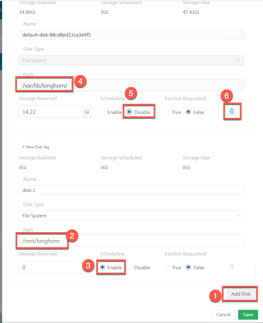 Click on Add Disk, add the new disk path /mnt/longhorn that we created earlier and mark the disk as schedulable. Once we have done we need to remove the default disk which is at /var/lib/longhorn by setting it as unscheduable and deleting it