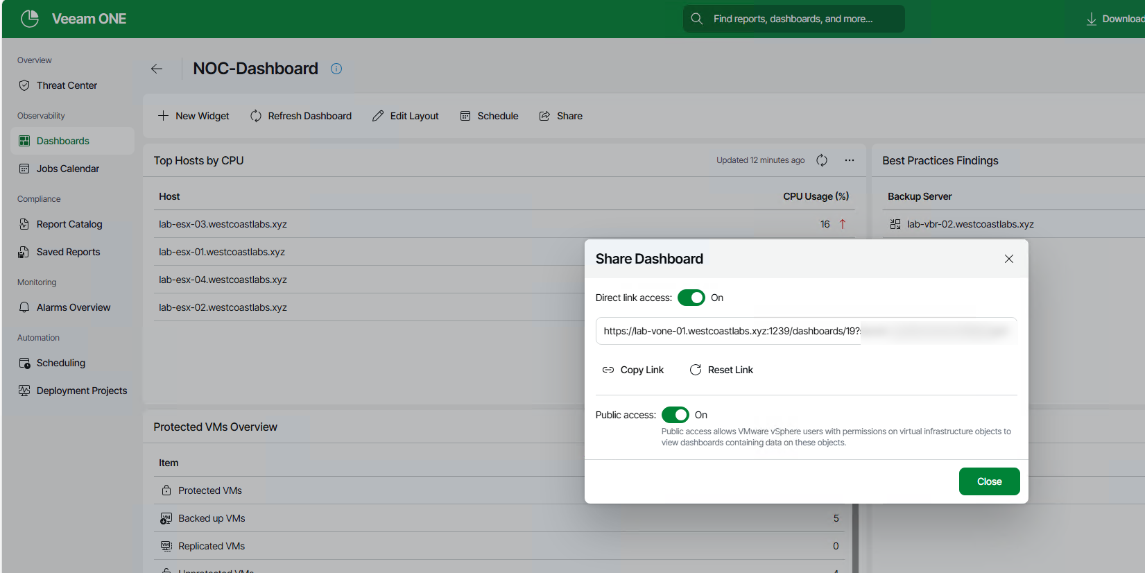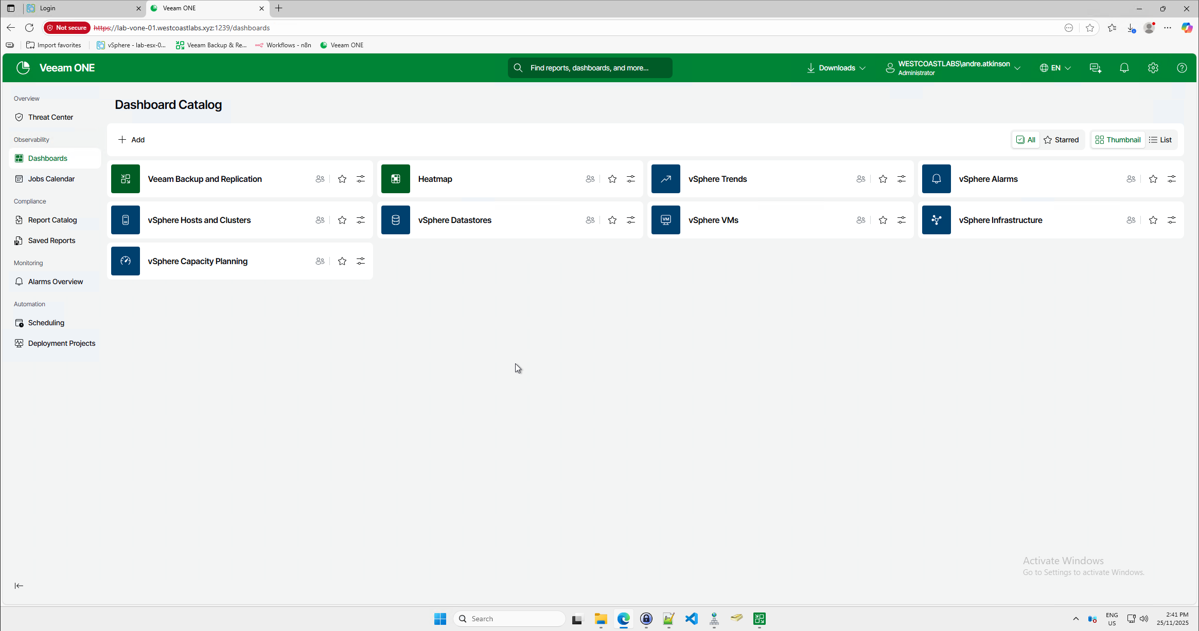 Once this is done, we can go back and open the dashboard tab. This will show us a bunch of pre-created dashboards based on what we have mapped, which in my case is VBR and vCenter.