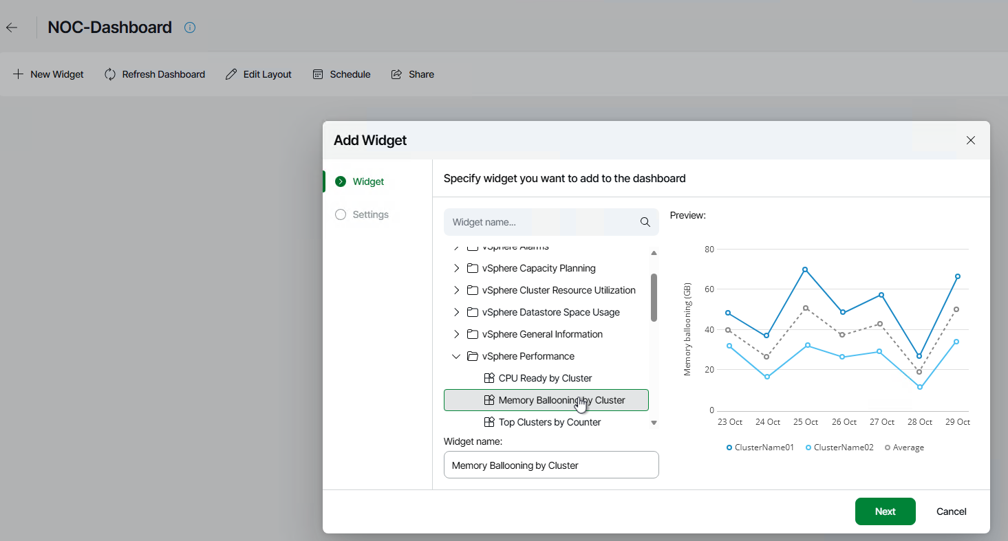 You can also add your own dashboard that you could leverage for a NOC, as an example, where they can keep a keen eye on your environment with the pre-created widgets: