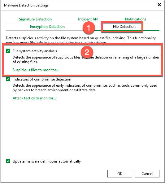 As I mentioned, whilst not strictly required, the two do work pretty hand in hand. With the addition of File System Activity Analysis, we can scan the guest VM and detect the appearance of suspicious files, the deletion of a large number of files, etc. This does require guest indexing to be turned on.