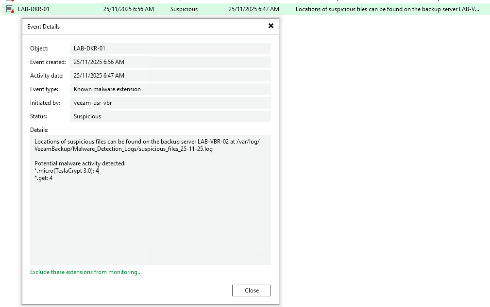 As we can see here, Veeam took a backup of my Docker server and has found some potential malware activity, which can then let me trigger an alert off to my SIEM system or alert my SOC via the epic dashboards we created previously, or even scan them for a deeper analysis, which is a great segue into the next post: what we can do AFTER a backup has been taken.