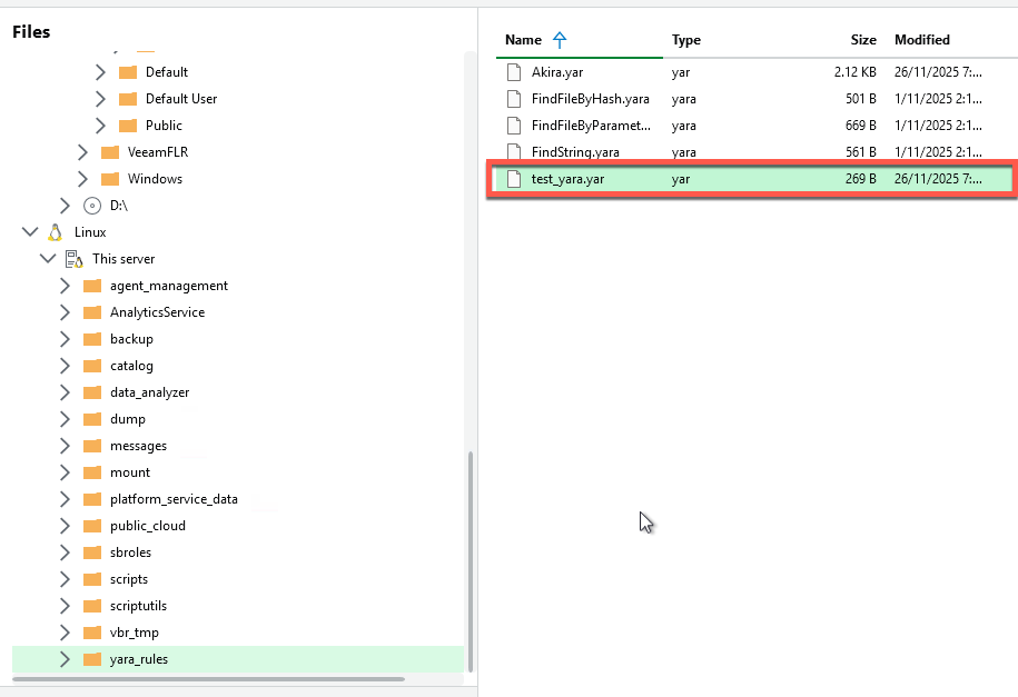 - Place the YARA file with the .yara or .yar extension in the C:\Program Files\Veeam\Backup and Replication\Backup\YaraRules folder (for Veeam Backup & Replication on Microsoft Windows) or in the /var/lib/veeam/yara_rules/ directory (for Veeam Backup & Replication on Linux). You can add the file through the File view in the Veeam Backup & Replication console.