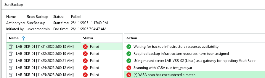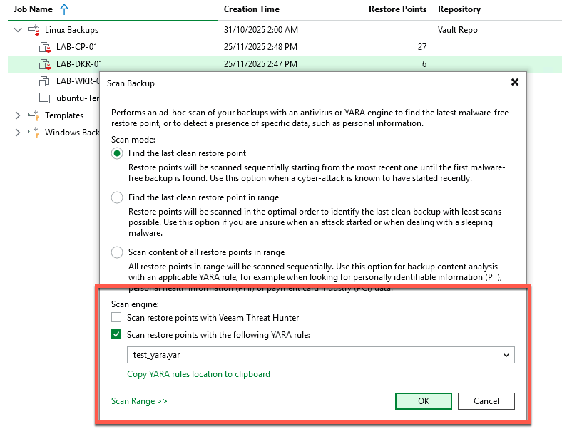 - After backup: YARA scanning and Veeam Threat Hunter for validation before restore