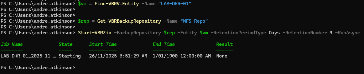 Start-VBRZip -BackupRepository $rep -Entity $vm -RetentionPeriodType Days -RetentionNumber 3 -RunAsync