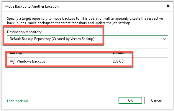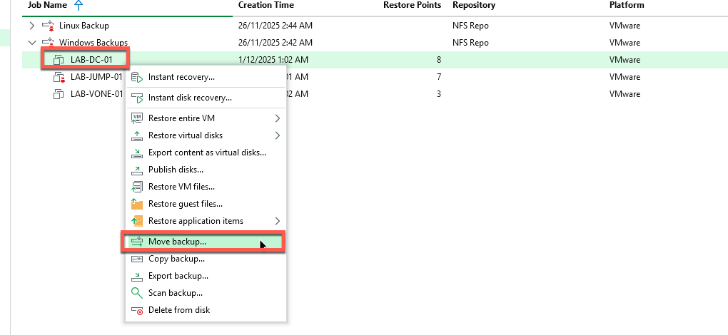 Backup Move is the ability to move backup chains between repositories or jobs, this really opened up so many doors for me when it came out as suddenly a hardware refresh wasn’t a 6 month pain to move data between repos, it became a simple right-click.k.