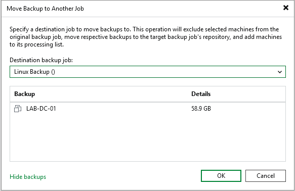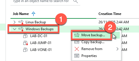Having the ability to move a VM between jobs, moving workloads and their backups to another backup job can be helpful if you want to separate one backup job into multiple backup jobs or if you want to change backup settings for specific workloads. Also, you want to continue the existing backup chains for the workloads.