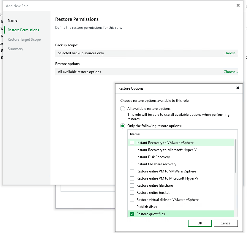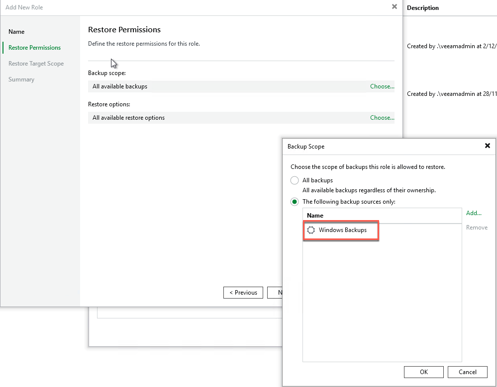 - Give your role a name and select the scope (in my case, “Manage Restores”)