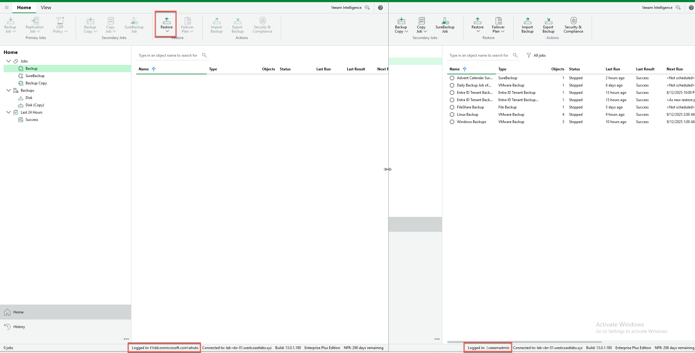When I log into the console, we can see that our SAML user has been restricted completely—not even able to see any backups. All additional options have been greyed out as well, leaving only the restore option available.