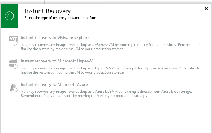 If we launch the restore wizard and follow the bouncing ball, we will see that all other restore options have been disabled. Whilst you can click through, it ultimately greys out and blocks you from moving any further.