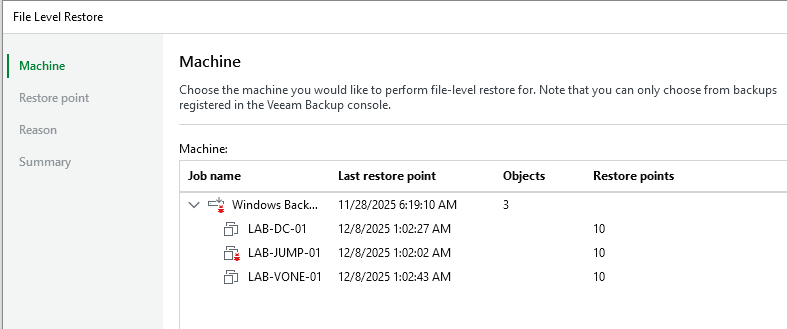 If I click through the file recovery wizard, we can see I have the option to select the restore point and successfully complete a single file restore.